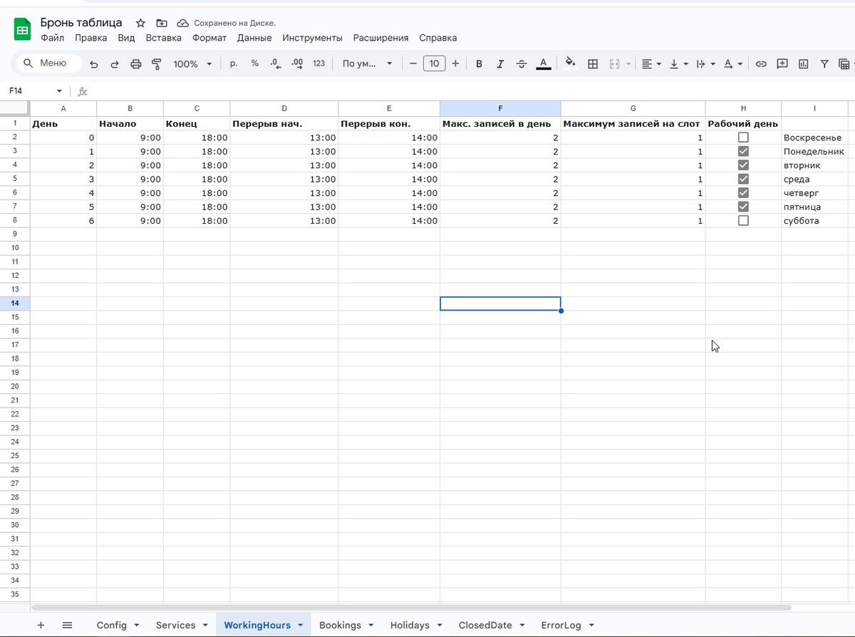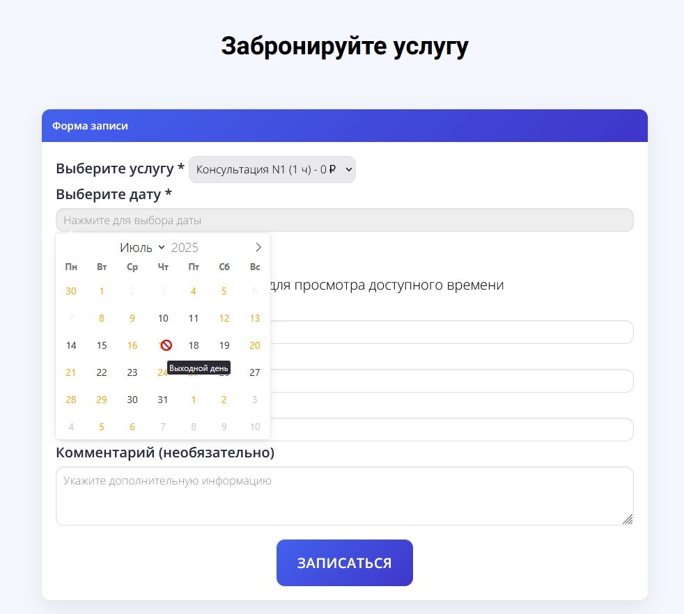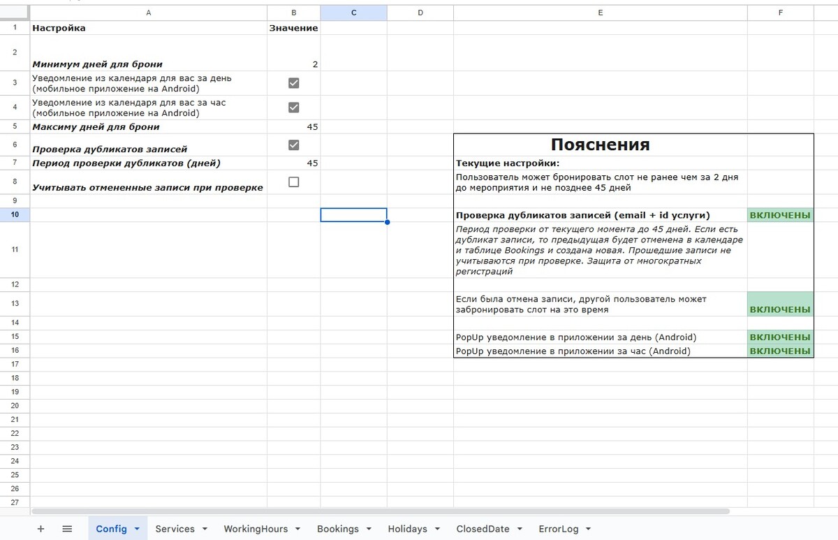 - Умное формирование слотов — учитываются рабочий график, праздничные дни (настраиваете вы) и другие ваши события в Google Календаре.