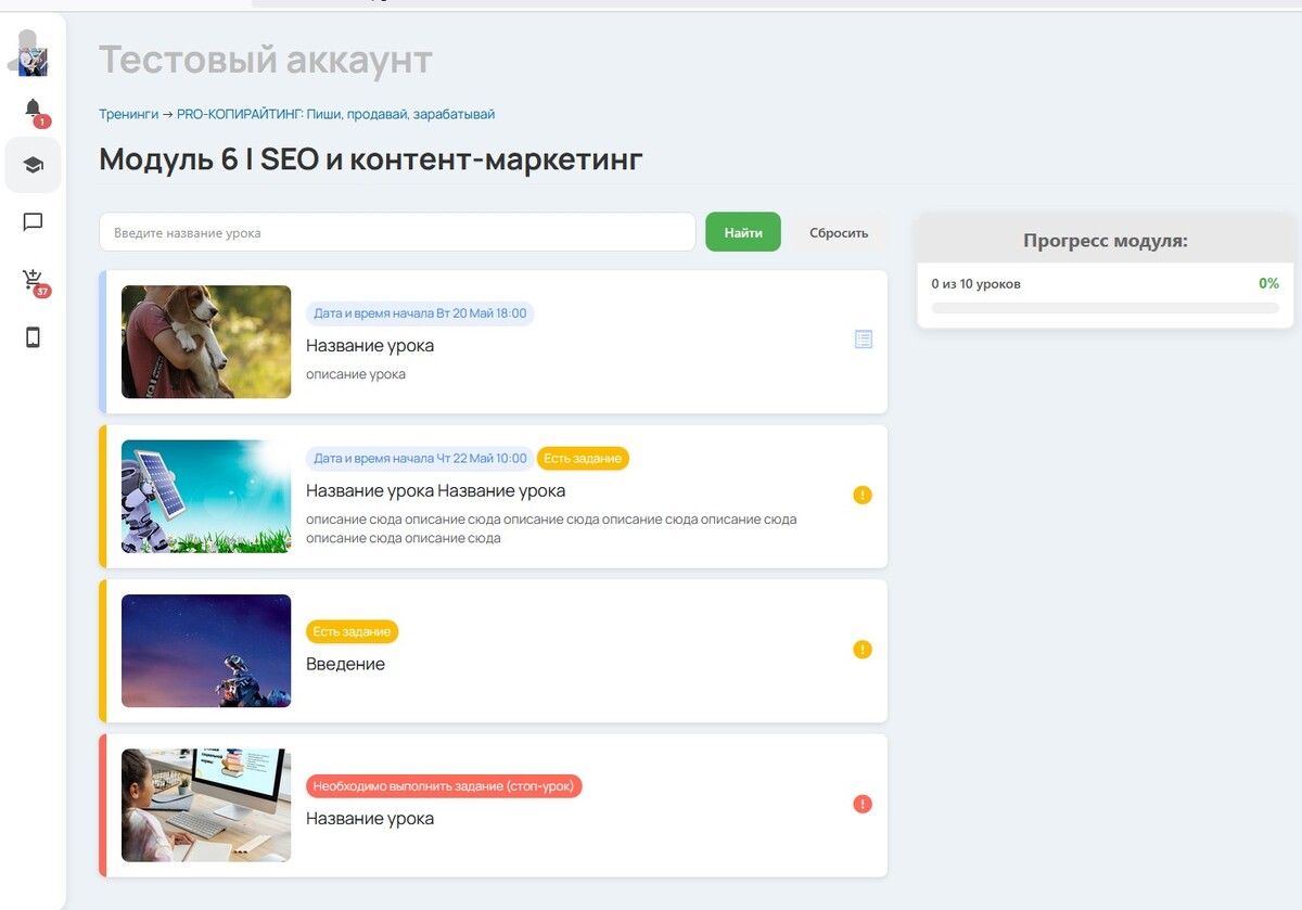 Если вам нужен глобальный поиск по всем урокам и тренингам, которые доступны ученику, используйте другой блок «Глобавльный поиск»