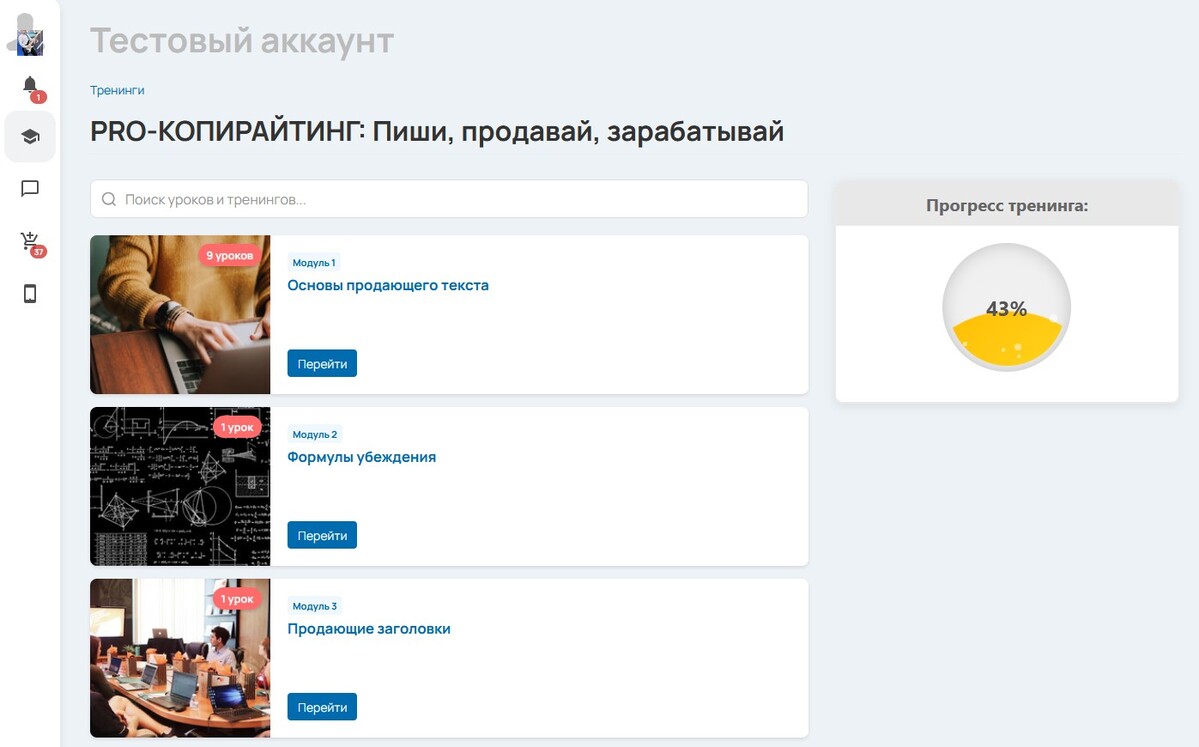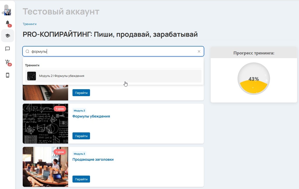 Строка глобального поиска для поиска уроков и тренингов Getcourse, которые доступны ученику