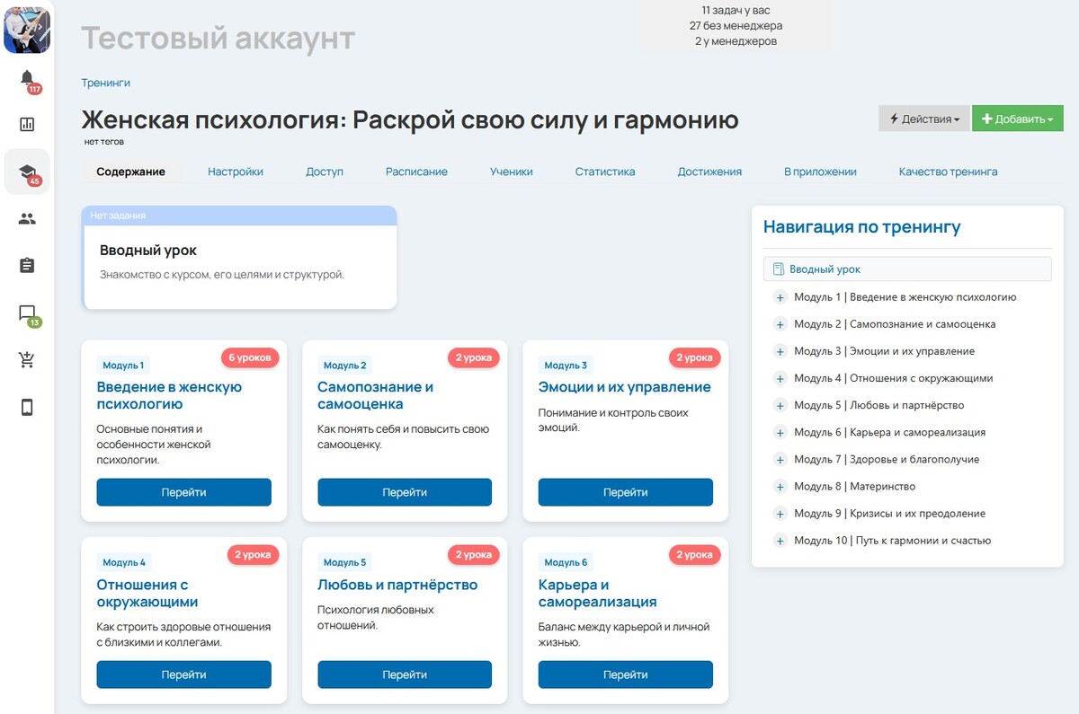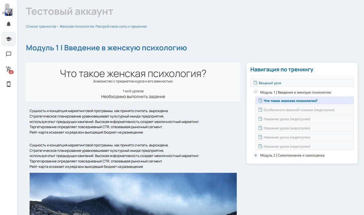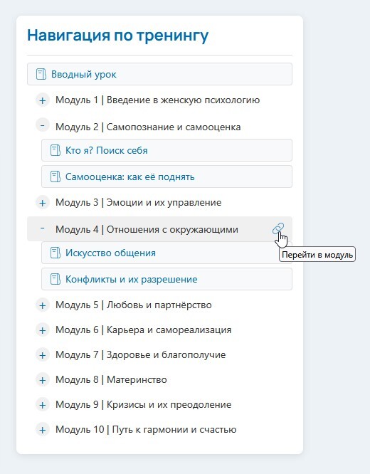 ✅ Отображает дерево модулей и уроков только того тренинга, который открыт у ученика.