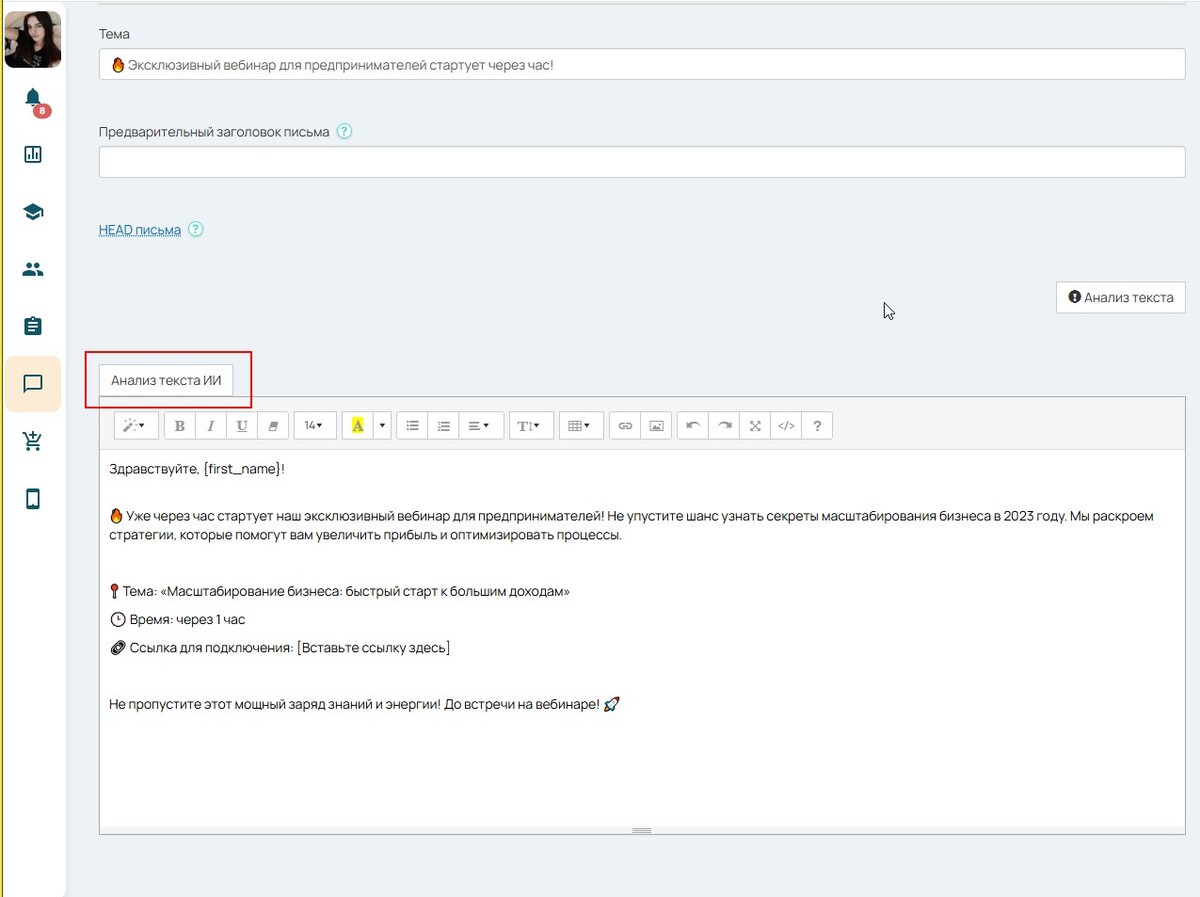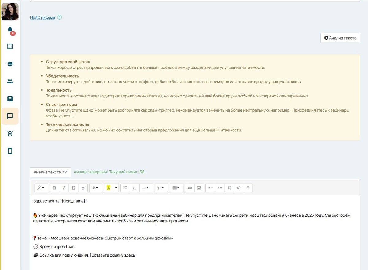 Этот инструмент использует искусственный интеллект для глубокого анализа текста любой рассылки Getcourse и предоставляет рекомендации по его улучшению.