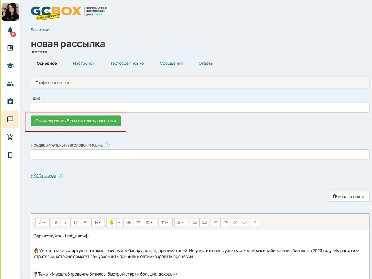 Перед созданием тем напишите основной текст письма — ИИ будет анализировать его
