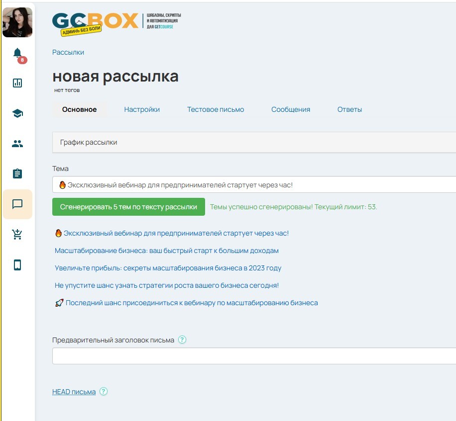 Этот инструмент использует искусственный интеллект, чтобы мгновенно создавать 5 вариантов цепляющих заголовков для ваших рассылок в Getcourse.