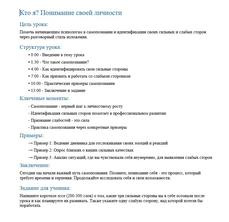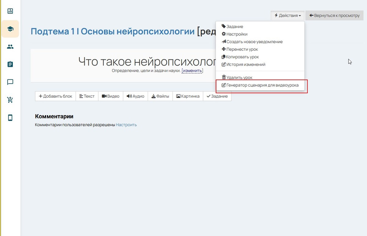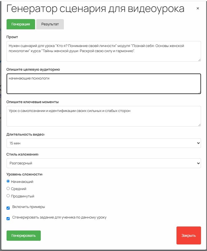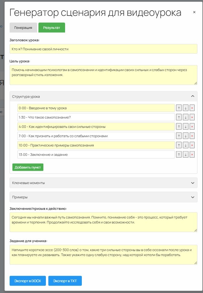 Этот инструмент использует искусственный интеллект для автоматического создания профессиональных сценариев видеоуроков и практических заданий.