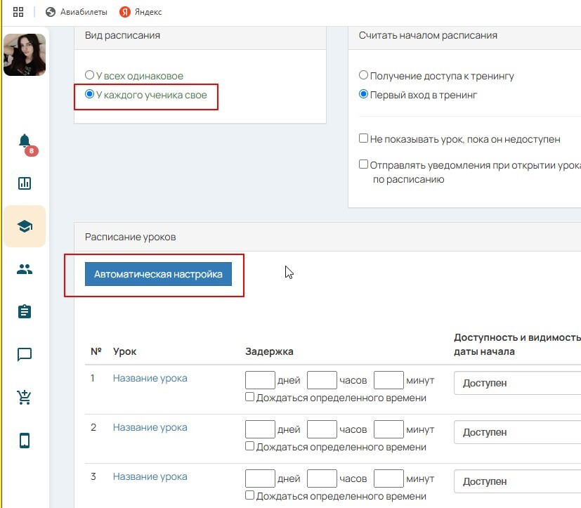 Автоматическая настройка расписания «У каждого ученика свое» в Getcourse