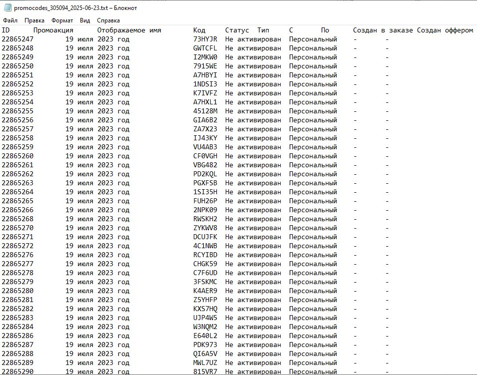 - Выгрузка работает даже для крупных акций с тысячами промокодов