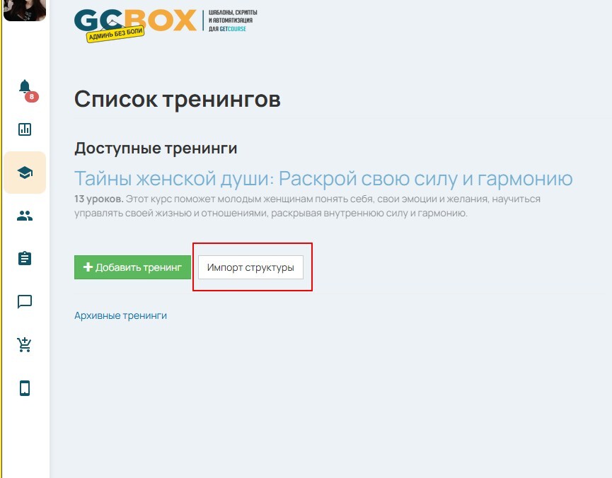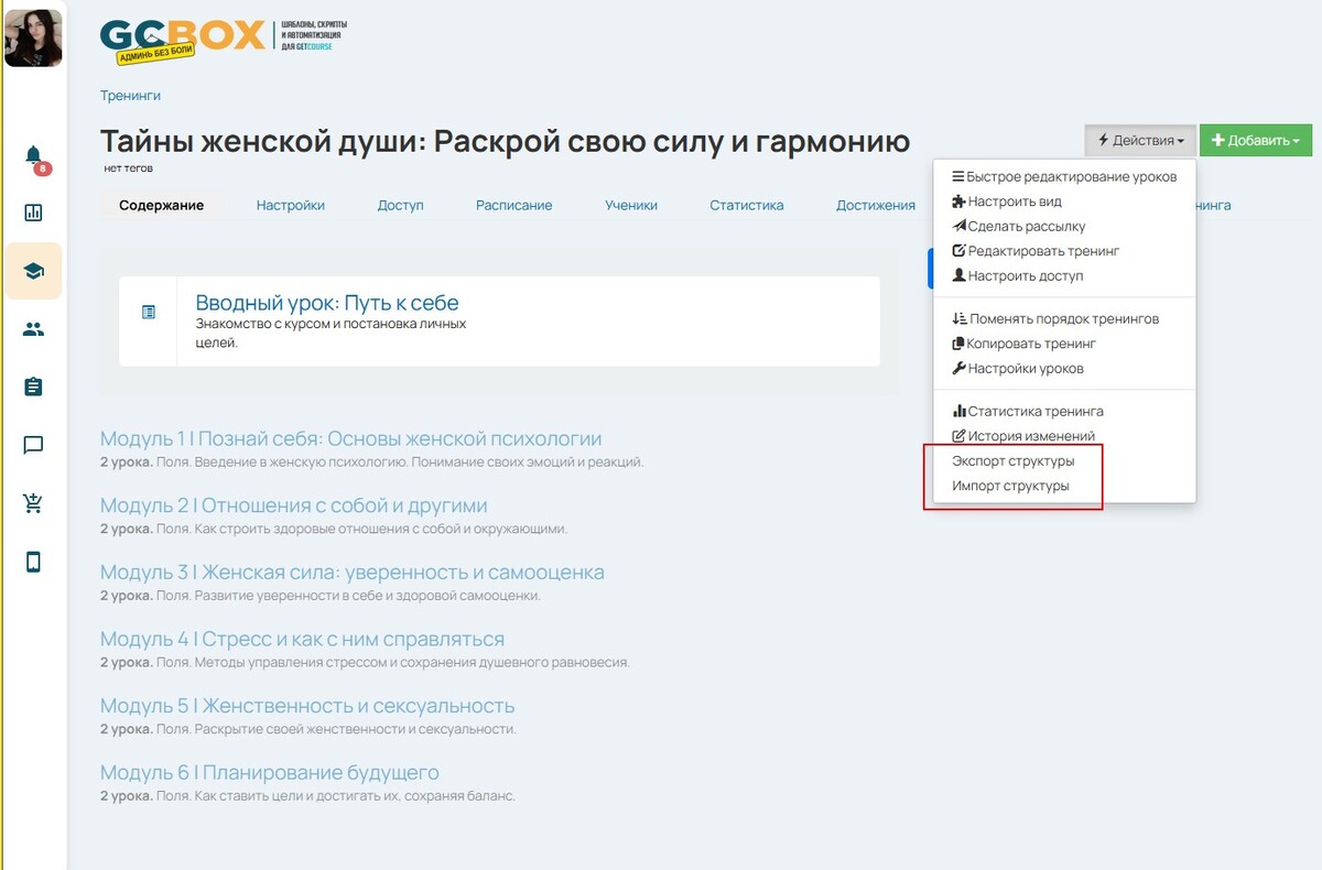 Этот инструмент позволяет быстро копировать и переносить структуру тренингов, сохраняя все уровни вложенности (тренинг → подтренинги → уроки), внутри одного или между разными аккаунтами Getcourse.