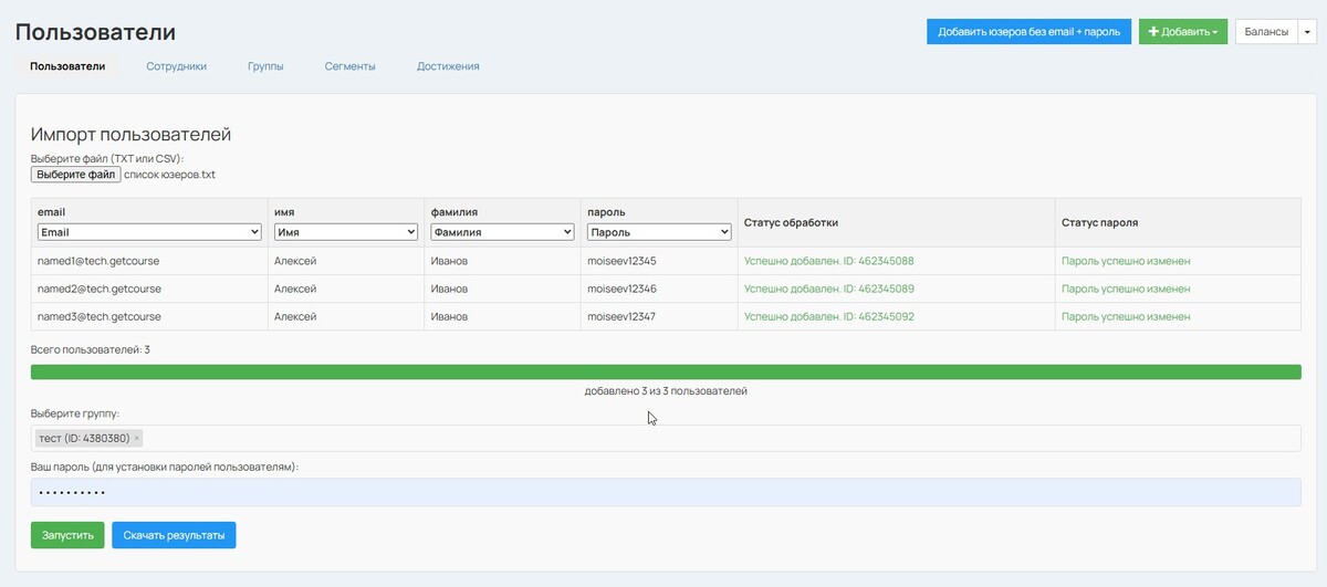 🔹 Можно установить пароли уже добавленным ранее пользователям с почтой @tech.getcourse