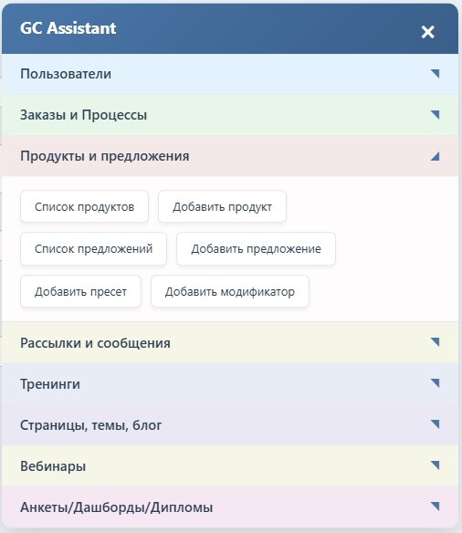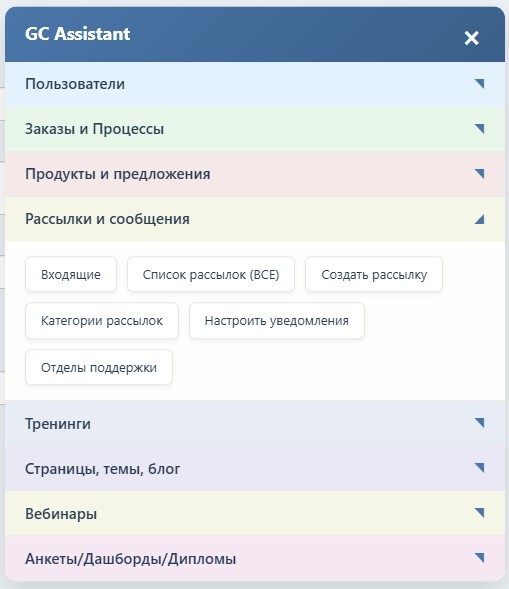 Окно с быстрым доступом в разделы аккаунта Getcourse
