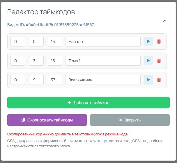🔹 Визуальный редактор — добавляйте и редактируйте таймкоды прямо в интерфейсе Getcourse