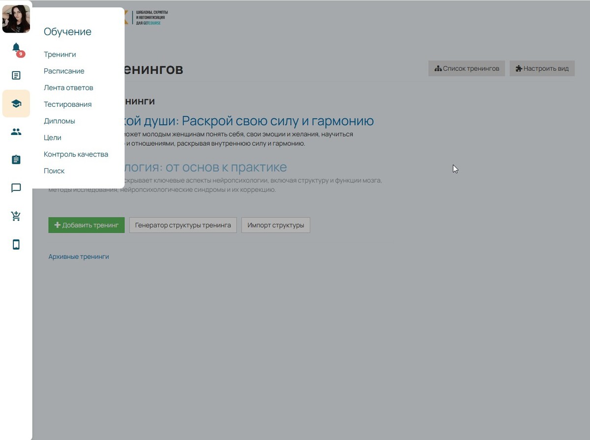 Оформление меню личного кабинета Getcourse №1