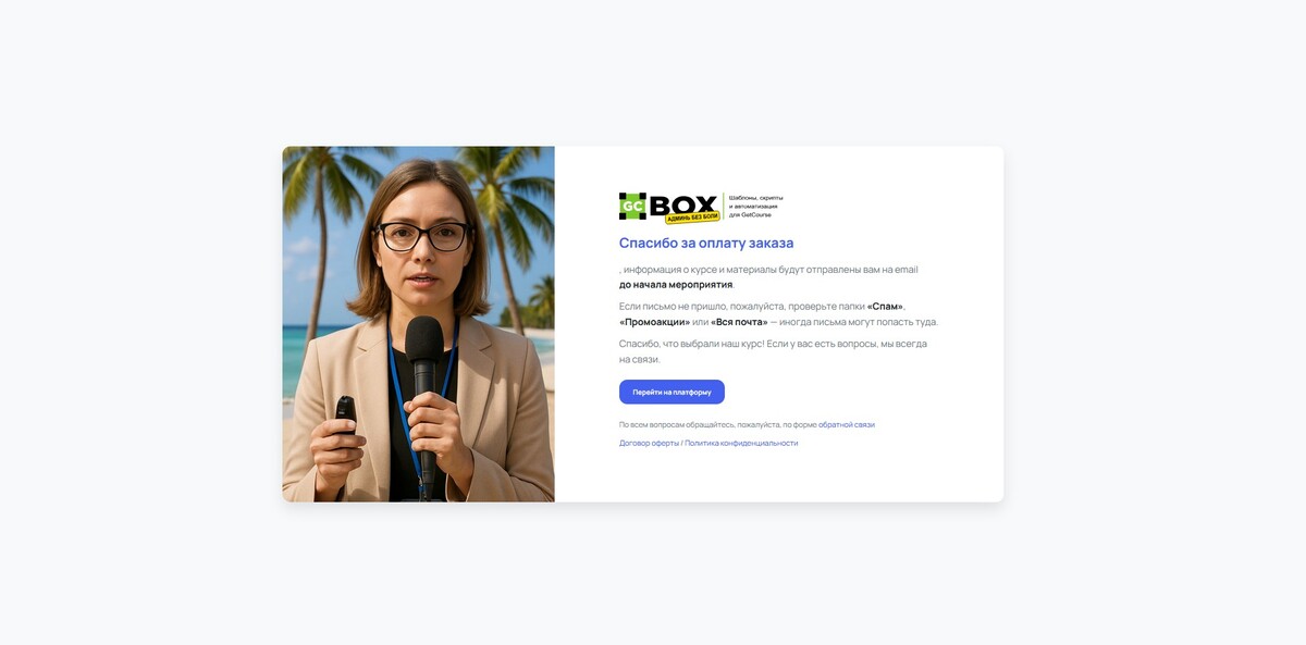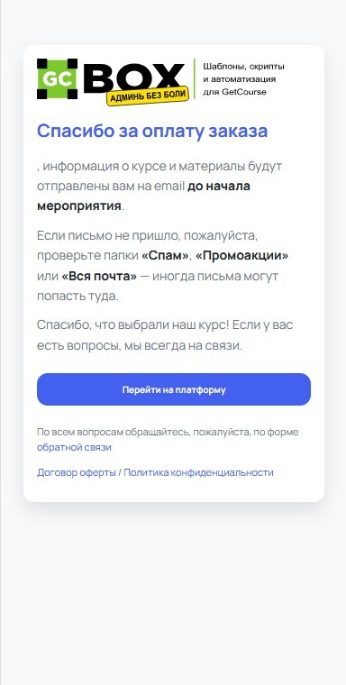 - Оформление страницы после успешной оплаты для аккаунтов Getcourse
